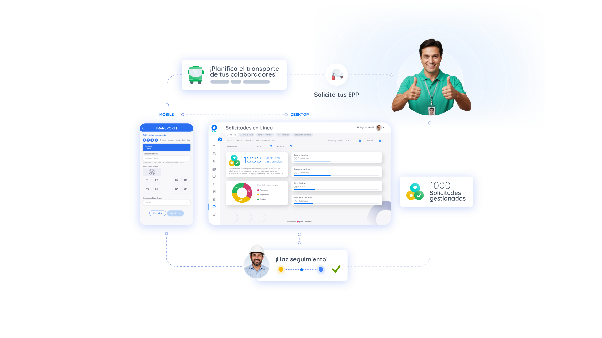 Crea transportes y programa rutas en línea. Desde cualquier lugar tus colaboradores podrán solicitar su transporte a casa o faena.